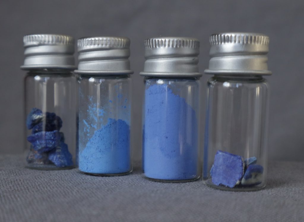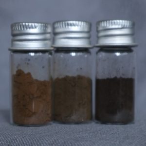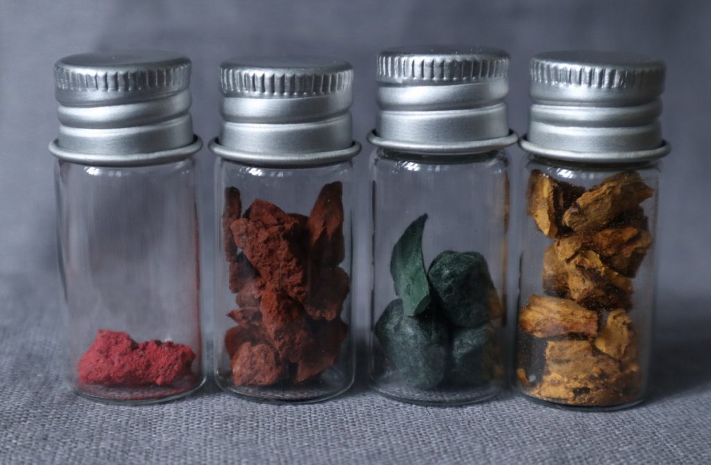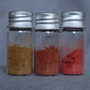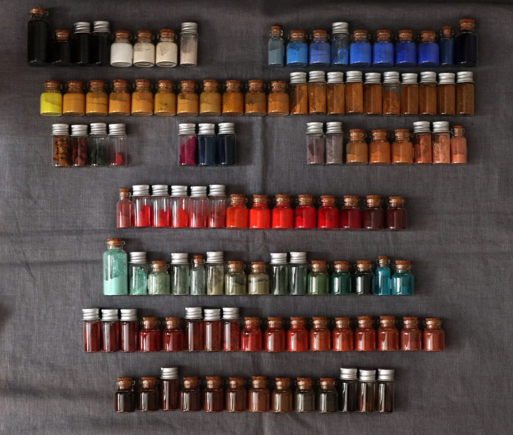 În decursul anilor am cumpărat diferiți pigmenți în cantități variabile, de la kilograme la doar câteva grame. Am început să îmi formez o colecție alcătuită din mici recipiente de sticlă care să îmi permită identificarea cu ușurință a unui pigment și efectuarea de teste rapide în vederea alegerii unei anumite nuanțe.